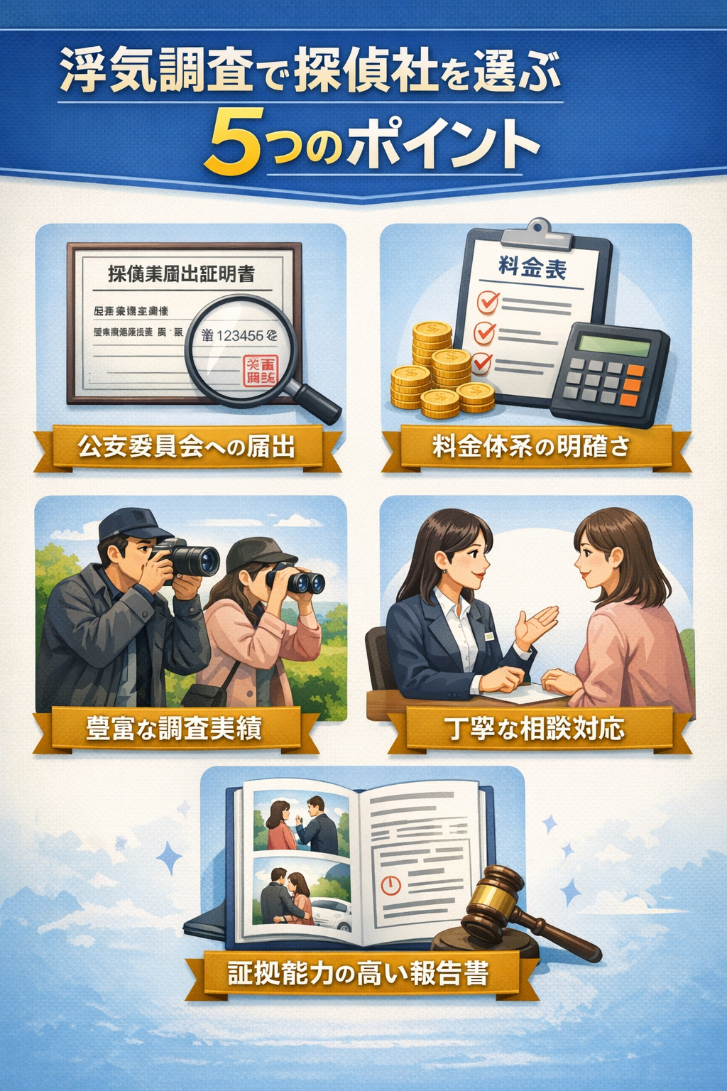 ここでは、浮気調査を依頼する前に確認しておきたい探偵社選びのポイントを紹介します。
