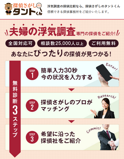 「探偵さがしのタントくん」は、相談内容に合わせて最適な探偵事務所を紹介してくれるサービスです。
